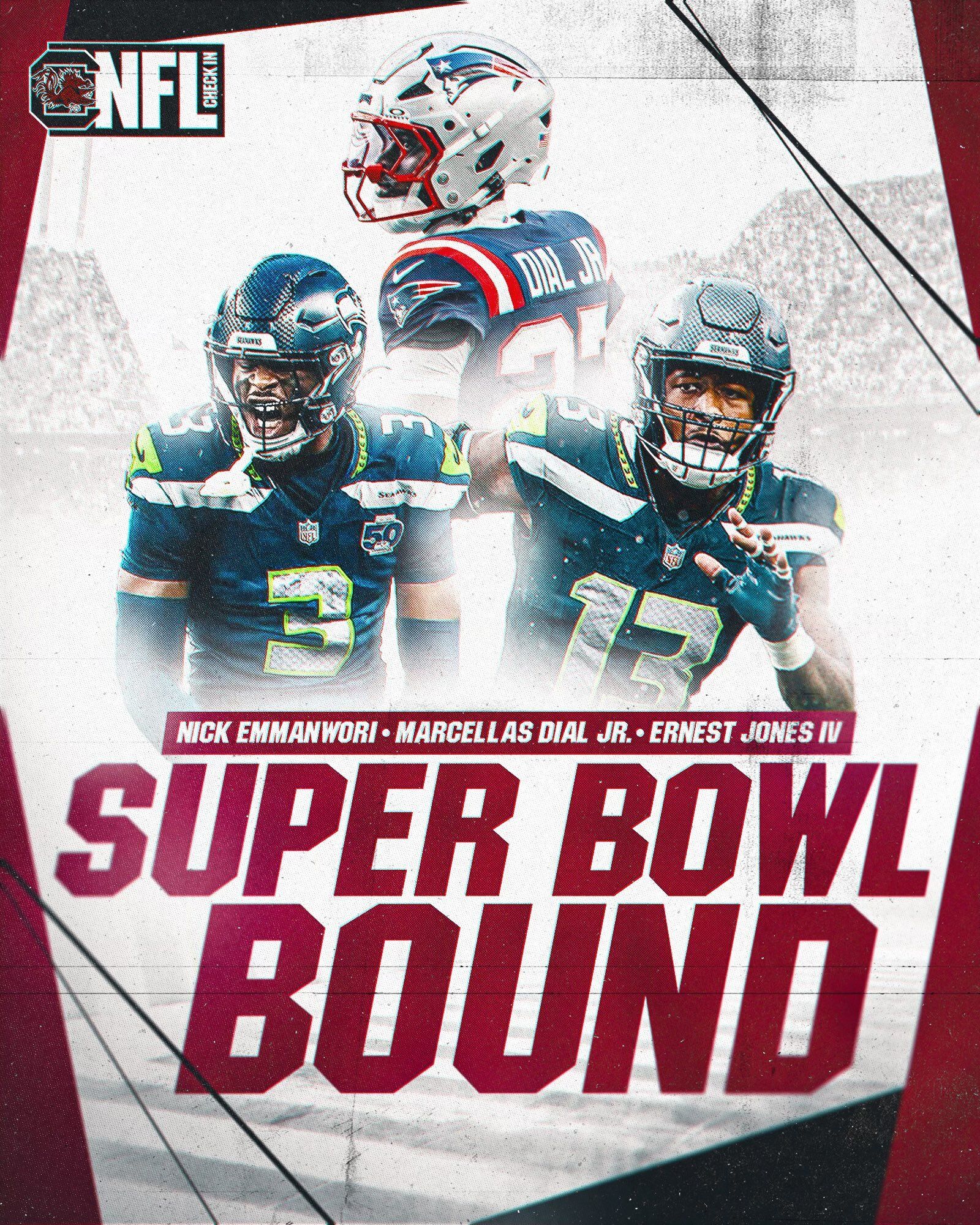 Good Morning, Gamecocks! Three former Gamecocks are headed to the Super Bowl! Congratulations to New England’s Marcellas Dial Jr. and Seattle’s Nick Emmanwori and Ernest Jones IV.