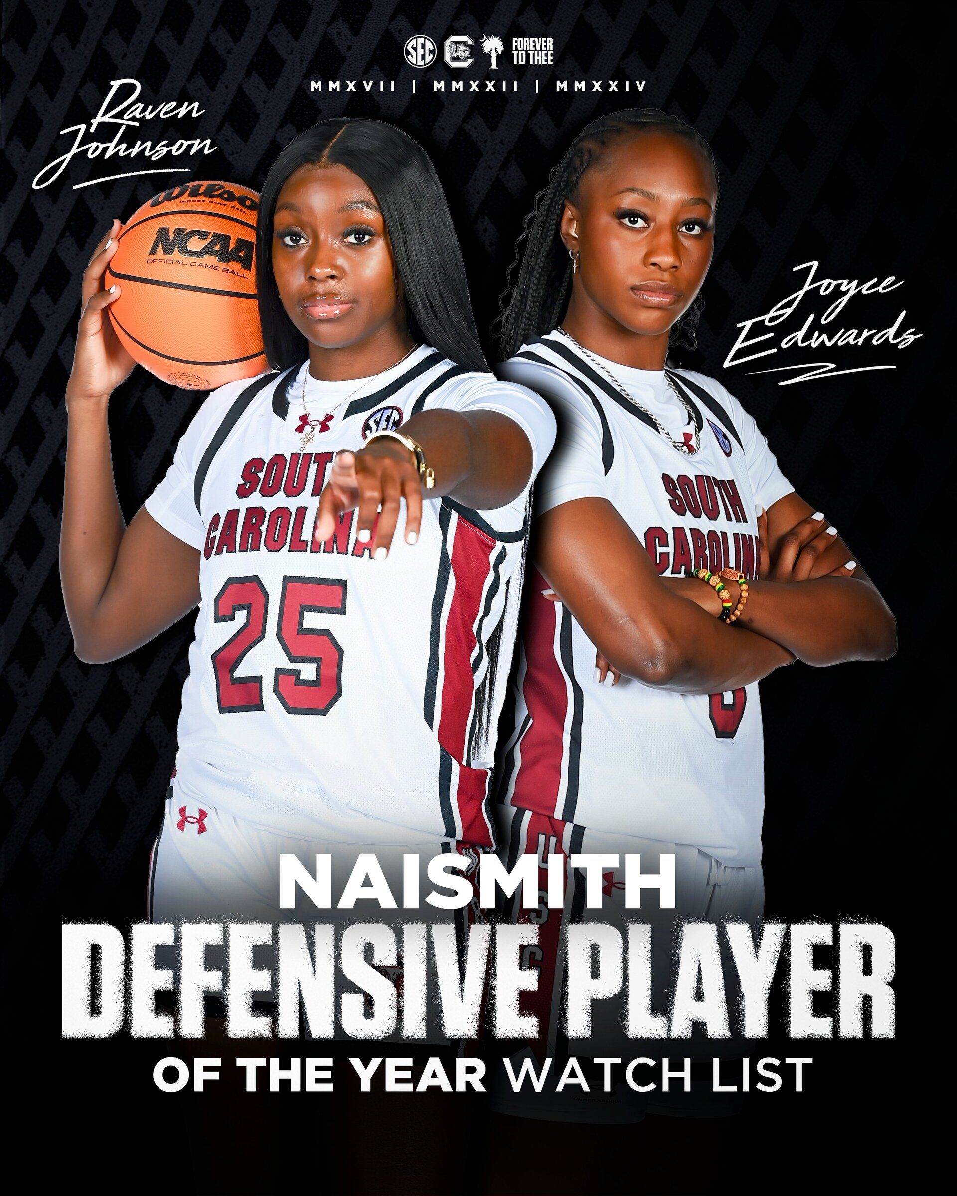 🔺 Lock Down Defense. Two Gamecocks were named to the 2026 Naismith Women’s College Defensive Player of the Year watch list! Joyce Edwards and Raven Johnson make South Carolina one of three schools with multiple selections.