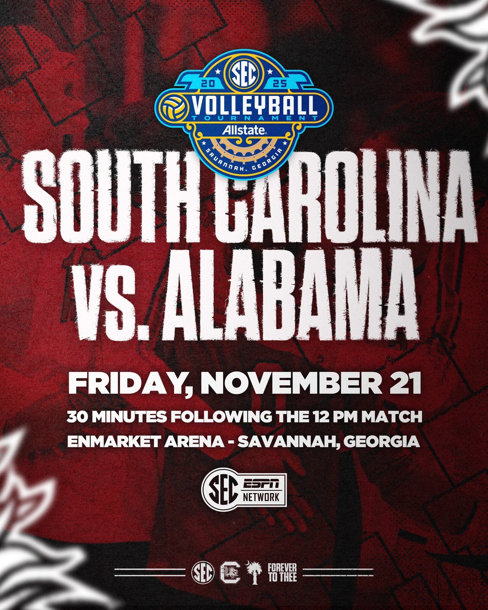 🔺 Tourney Time. Gamecock volleyball begins postseason play today! The 13-seed Gamecocks will take on 12-seed Alabama in the first round of the SEC Tournament at 2 p.m. on the SEC Network. This year’s SEC Tournament is being played in Savannah, Georgia.