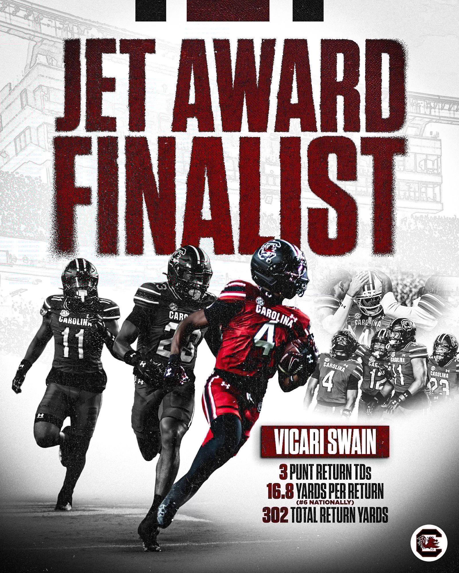 🔺 Jet Speed. Gamecock punt returner Vicari Swain has been named a Jet Award finalist! The award honors the most outstanding return specialist in college football. Swain has returned three punts for touchdowns. He ranks sixth nationally with 16.8 yards per return and has 302 total return yards.