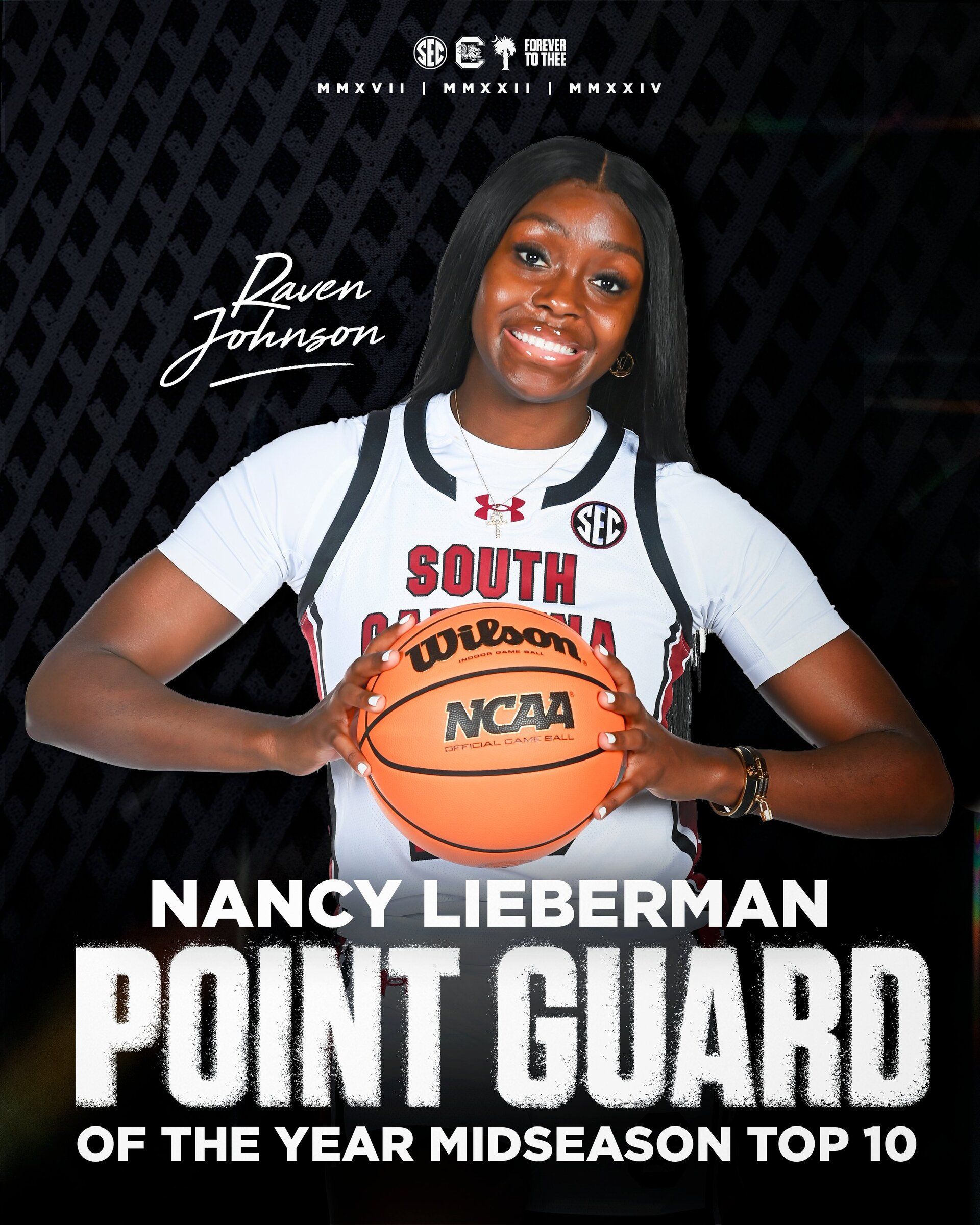 🔺 Running Point. South Carolina women’s basketball senior Raven Johnson was named to the 2026 Nancy Lieberman Award Midseason Top 10, recognizing the top point guard in the country. She has been to three Final Fours, won a national championship, and seen a runner-up finish during her time on the court. Johnson leads the SEC in shooting percentage against ranked opponents. She is currently fifth in program history in career assists.