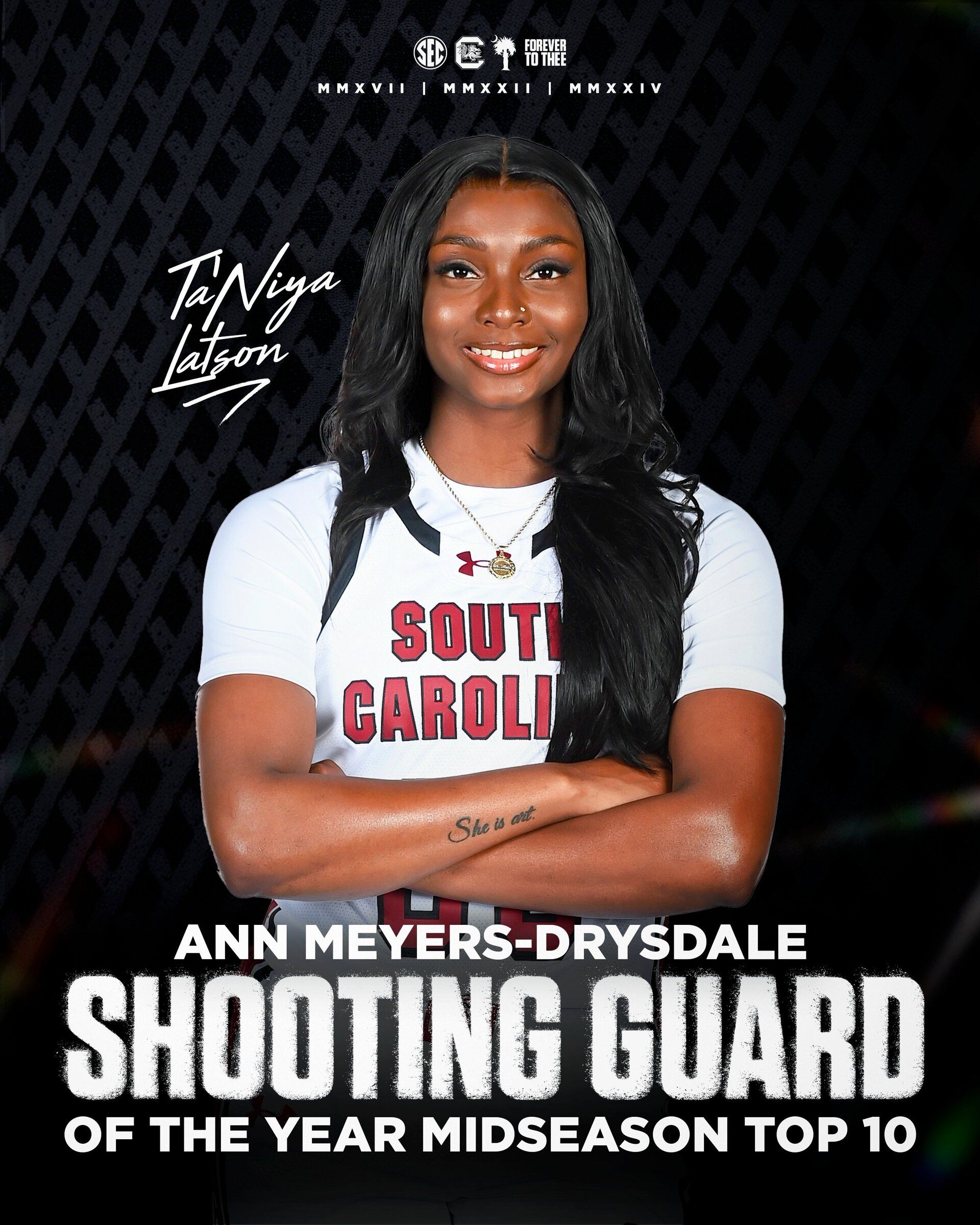 🔺 Shooters Shoot. South Carolina senior Ta’Niya Latson was named to the 2026 Ann Meyers Drysdale Award Midseason Top 10, recognizing the top shooting guard in the country. Latson is having her most efficient scoring season, ranking highly in the SEC in scoring, field goal percentage, assists, and free throw percentage. The winner of the award will be announced in late March.