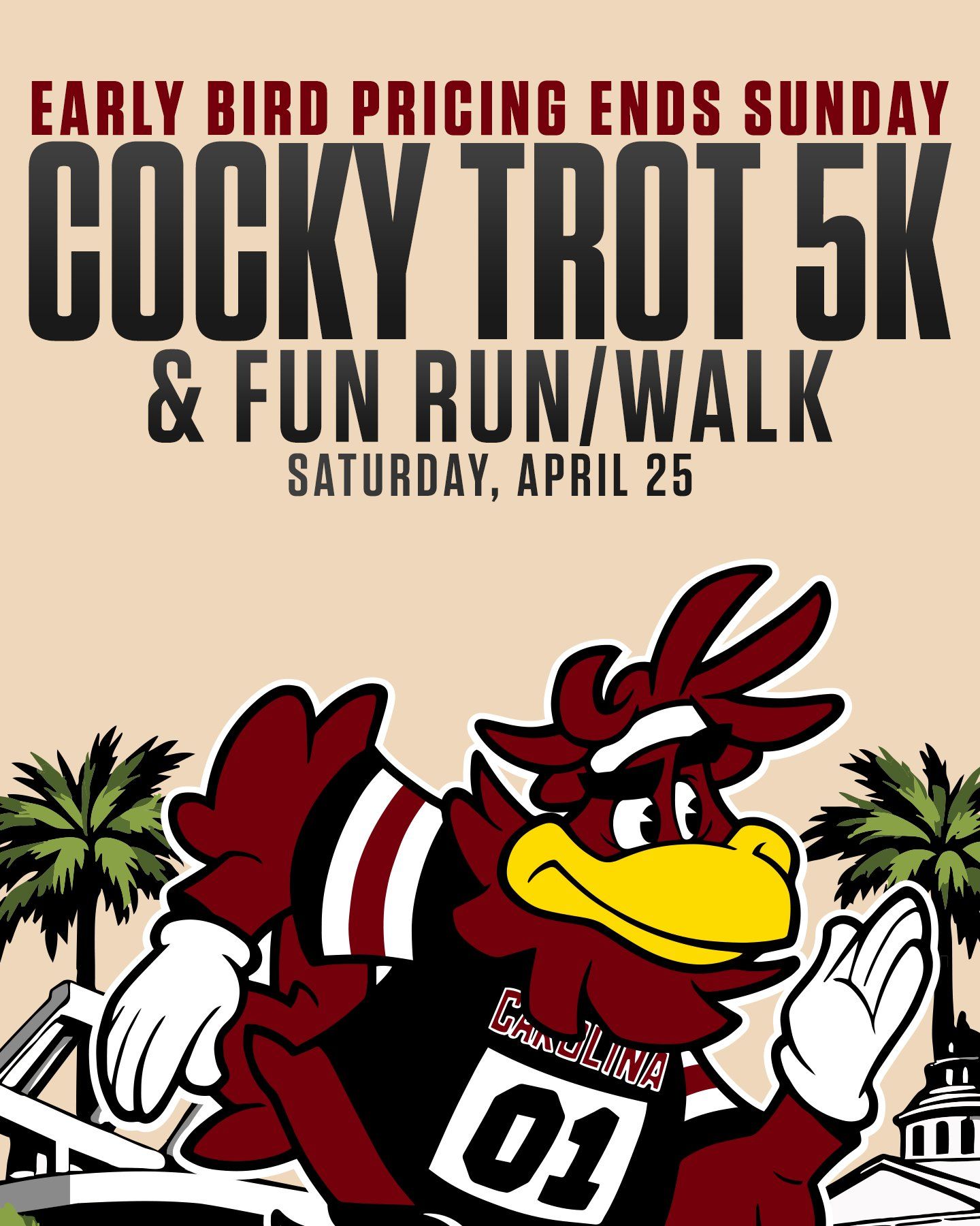 🔺 Early Bird Gets The Worm. The Cocky Trot 5K & Fun Run/Walk is right around the corner! Early bird pricing ends this Sunday, so register today! The race is April 25 at 9 a.m. at the South Carolina State Fair Grounds.