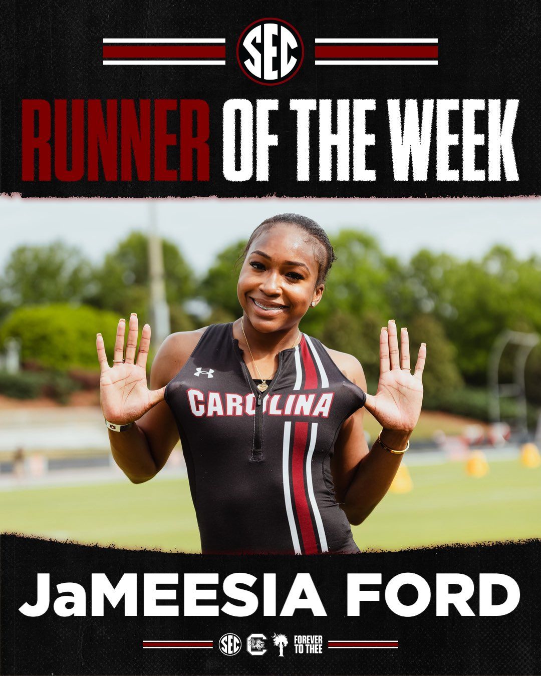 🔺 Ford Fast. South Carolina track & field’s JaMeesia Ford won the 100m and 200m at the Tiger Track Classic, setting a season best in the 100m and the fastest time in the NCAA this season in the 200m. South Carolina will compete in the East Coast Relays and the Duke Twilight this weekend.